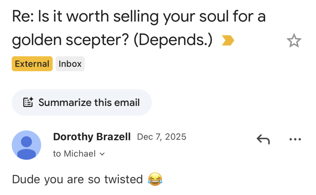 Unapologetic Capitalism: I will send you blatant sales pitches for my books. I will invite you to join my private community, The Vaudrium. In EVERY email. And I will not be subtle about it. I’m an author; I need to buy mushroom coffee to fuel the Well of Creativity.