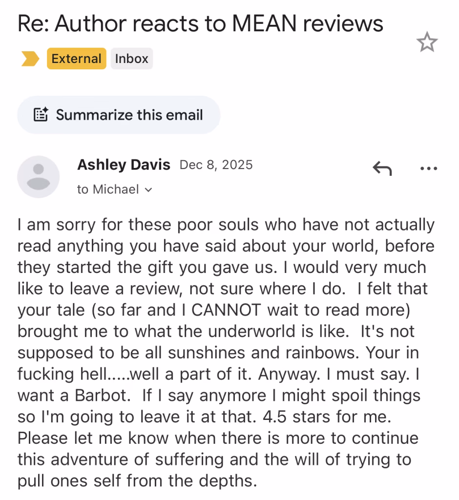 "I am sorry for these poor souls who have not actually read anything about your world, before they started the gift you gave to us .... 4.5 stars for me."